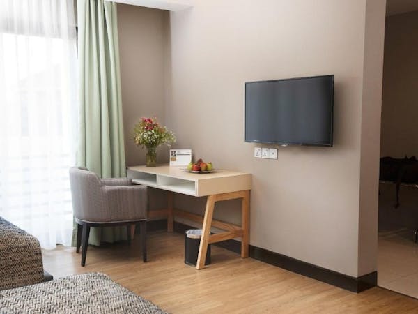 This spacious 50m² room has two separate sleeping spaces. The main bedroom has a large King bed (200cm wide), while the second sleeping area has two single beds, each 120cm wide.